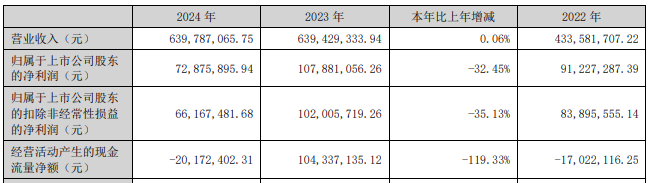 2024年,唐源电气营业收入为6.40亿元,同比增长0.06%;归属于上市公司股东的净利润7287.59万元,同比下降32.45%;归属于上市公司股东的扣除非经常性损益的净利润6616.75万元,同比下降35.13%;经营活动产生的现金流量净额为-2017.24万元,上年同期为1.04亿元。