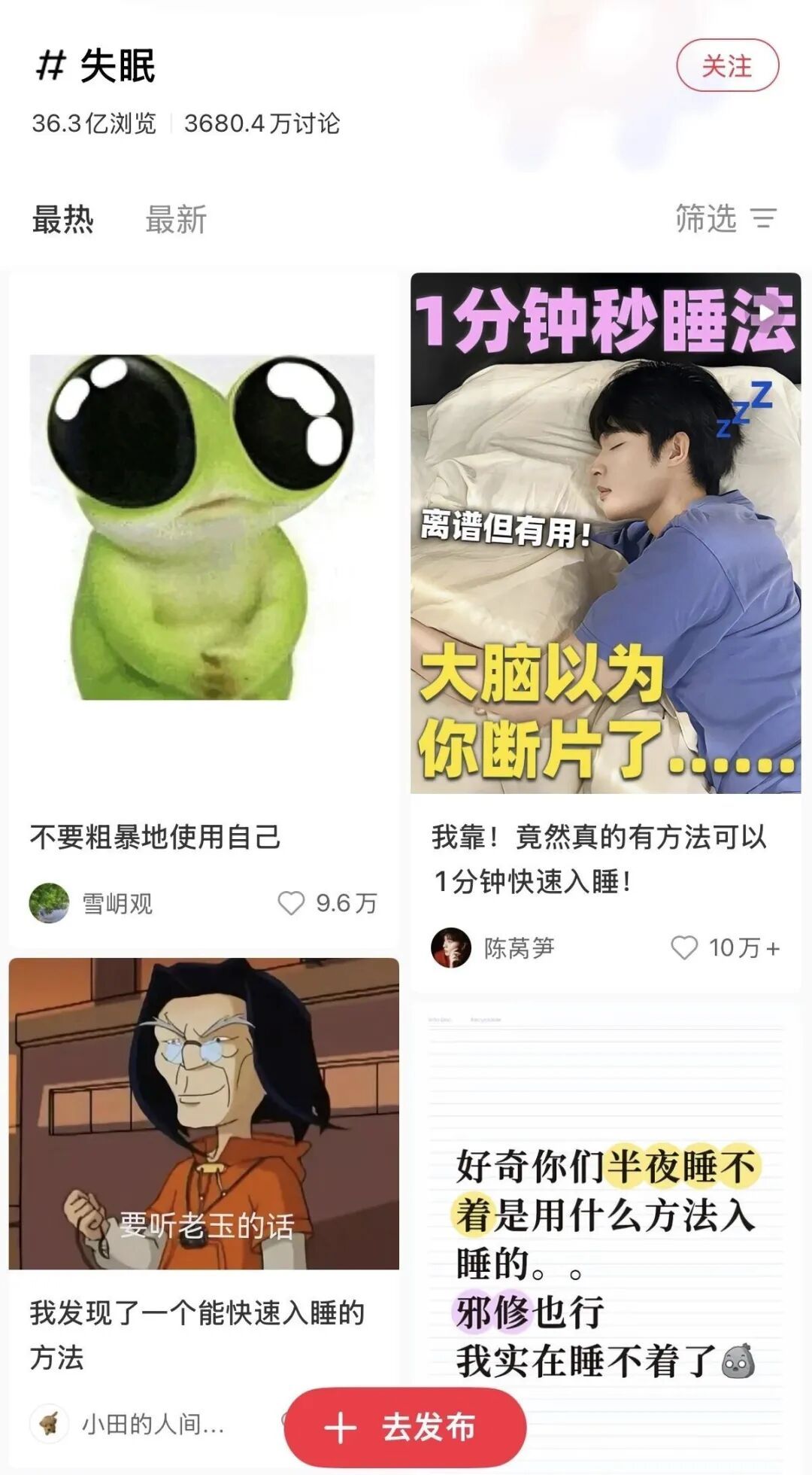 小凯的遭遇并非个例。只要你上网,你就一定能刷到失眠求助帖。在小红书,失眠话题的浏览量高达36.2亿,有3665.6万人次参与过这一话题的讨论。
